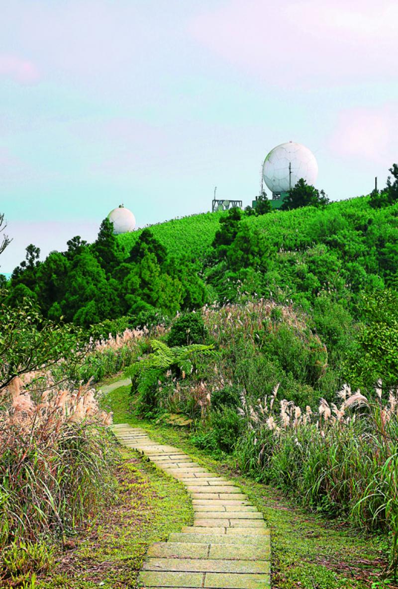 五分山氣象雷達站頂端兩顆白球,是山友們喜愛的取景角度。(記者沈昱嘉/攝影)