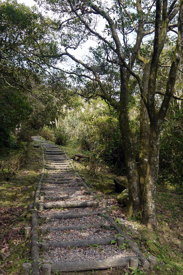 木棧步道入口處有一個掛有「牛碉(牛棚)」牌子的雨棚,現已廢棄不用,擺放了數張桌椅,成為登山客的休憩空間。有別於一般新修砌的花崗岩步道走來硬幫邦邦不舒服,步道以圓木條構築而成,走時可感覺腳下碎石、落葉摩娑的沙沙聲響,踩踏在泥土地上每步都感覺踏實。沿途林相茂密,即便是中午造訪也不覺酷熱,走過一小段上坡,即來到一處有兩三張木椅的小彎道,從這裡回頭一望,眼前即是一座座壯麗山峰,山林美景讓人驚嘆不已。